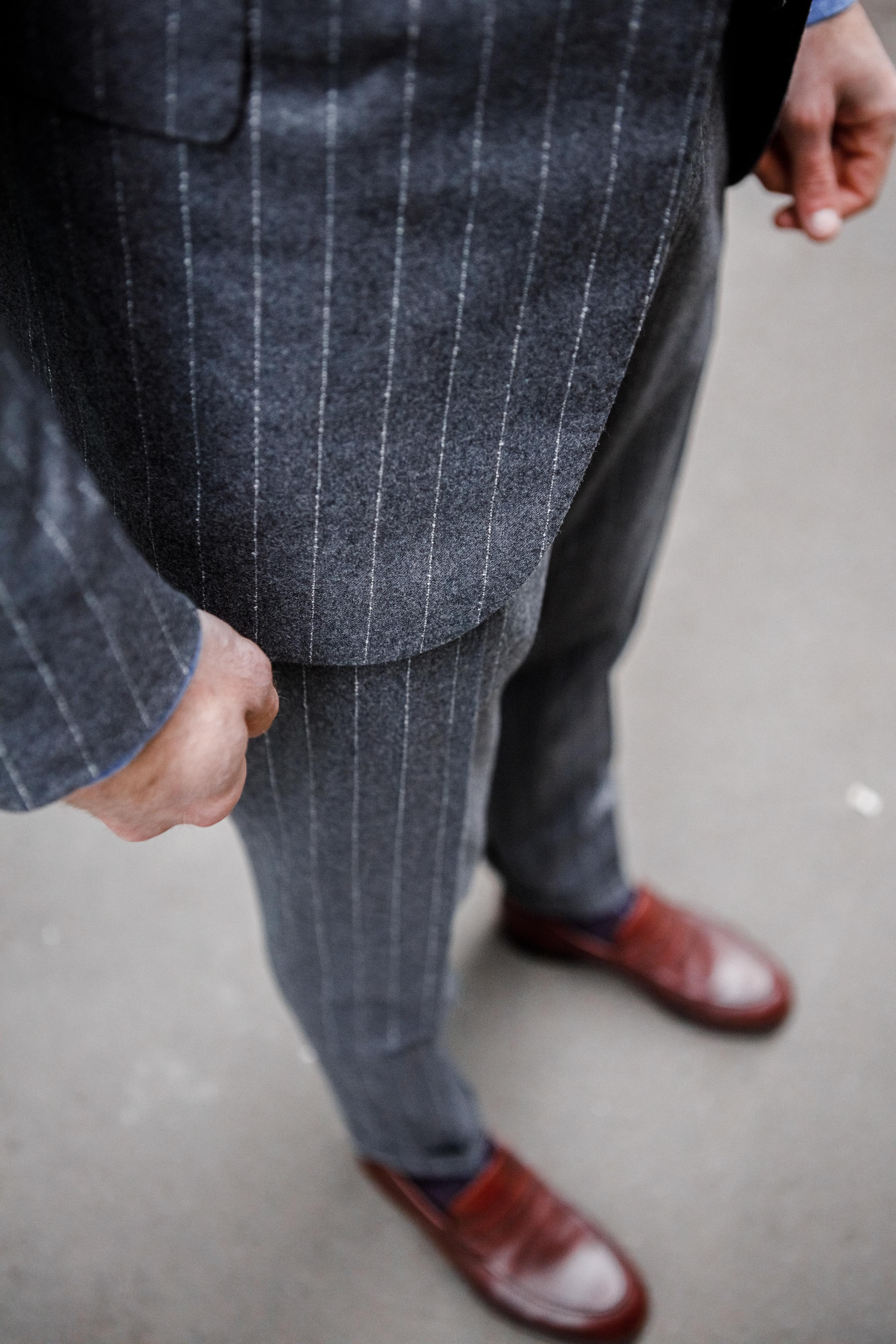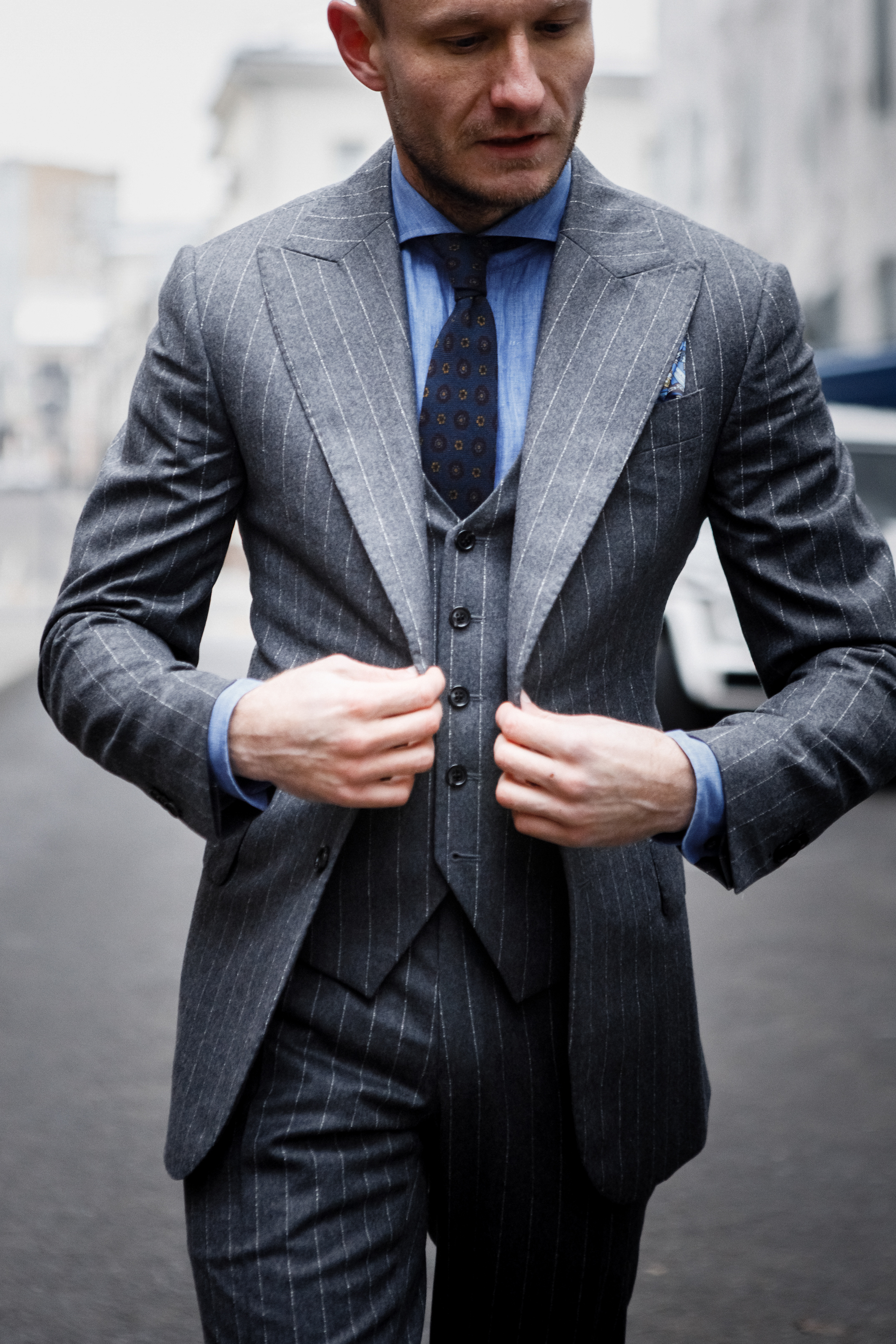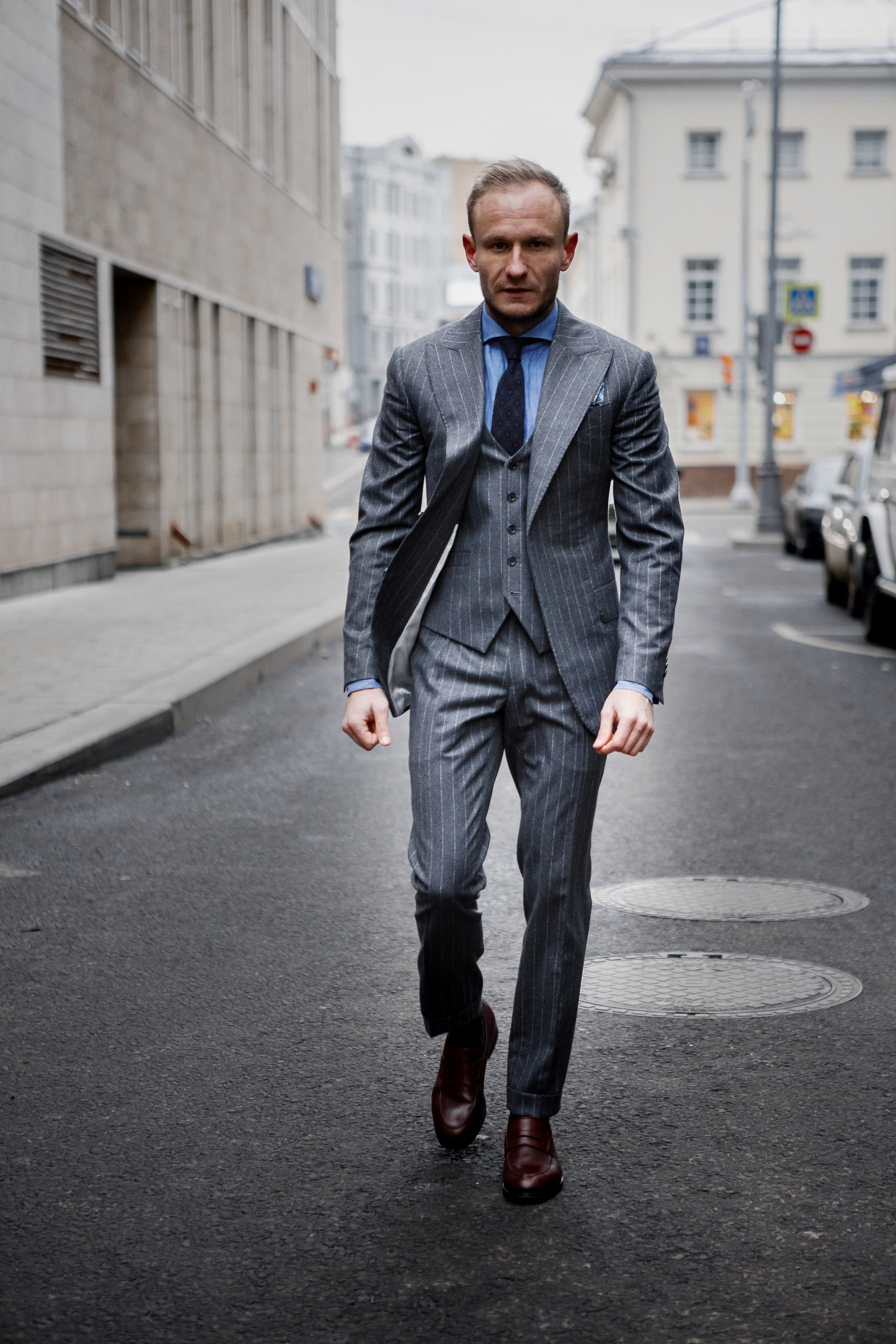 Идеальный серый костюм – это костюм-тройка в масштабную серую буклированную полоску, конечно же, из 100% шерсти от итальянской мануфактуры StylBiella.