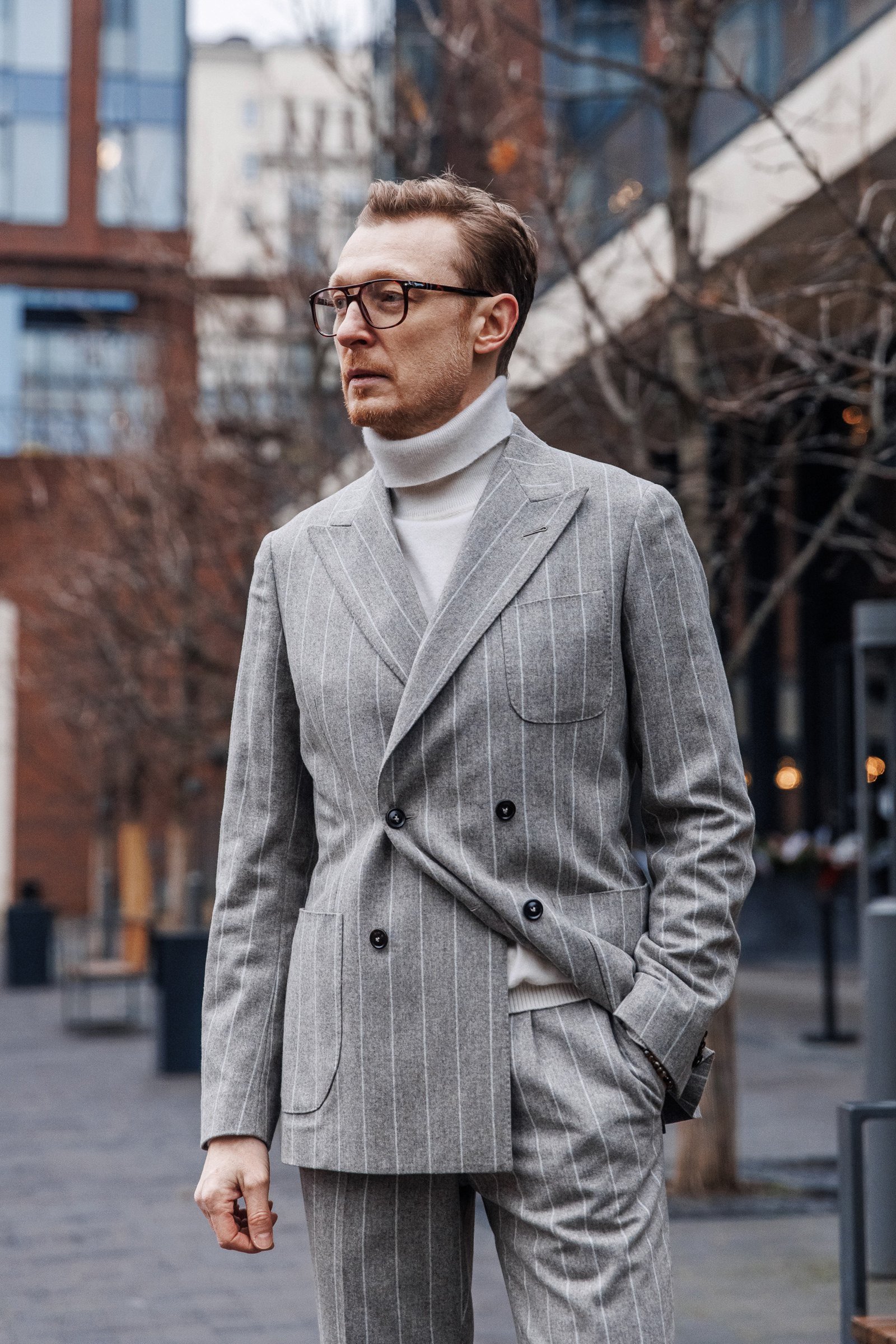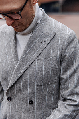 Костюм из ткани итальянского бренда Styl Biella с выразительной, масштабной полоской. Накладные карманы, пиковый лацкан, брюки с манжетами и защипами формируют собранный, актуальный и элегантный силуэт. Когда костюм — это про вкус, а не про скучные правила.