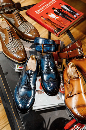 Броги из гладкой кожи с оригинальной патиной интенсивного синего оттенка. Ремень в цвет выкраса вашей пары – для нас нет ничего невозможного!