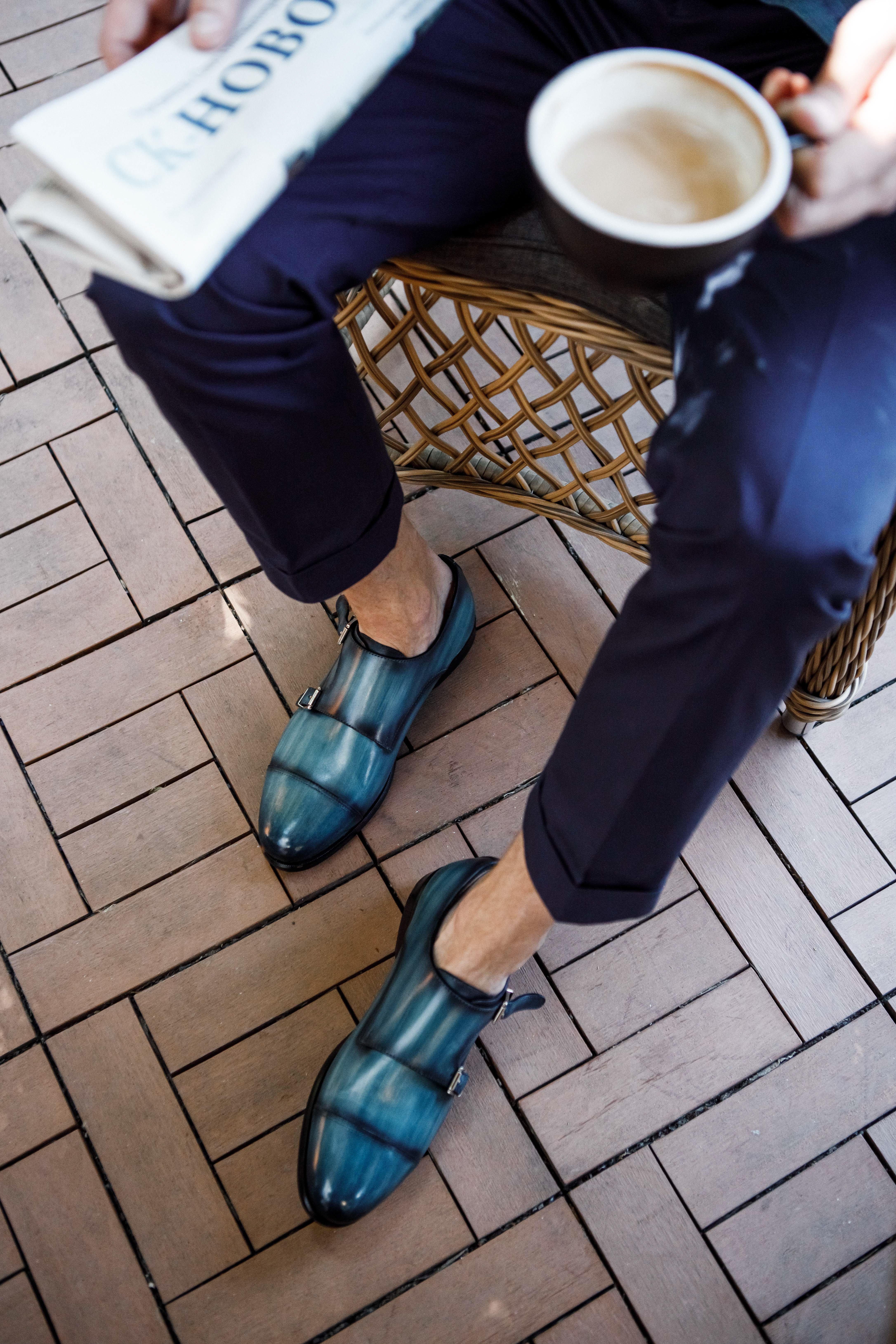 Двойные монки цвета "индиго" из гладкой кожи в ручном окрасе, глассаж в качестве финишной обработки - закажите такую же или создайте свой индивидуальный дизайн.