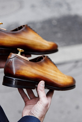 Оксфорды в ручном интенсивном окрасе с оттенками коньяка, глассаж в качестве финишной обработки – пришло время расширить границы классики.
