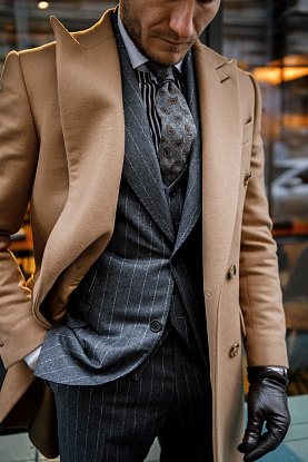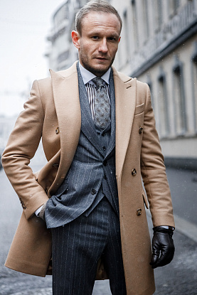 Классическое двубортное пальто песочного оттенка из шерсти мериноса итальянской мануфактуры StylBiella – беспроигрышный вариант, как в составе строгого образа, так и в сочетании с джинсами и трикотажем
