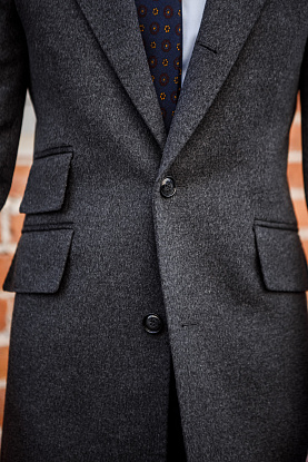 Темно-серое однобортное пальто из роскошного кашемира итальянской мануфактуры StylBiella – носите сольно, или в составе многослойного образа, комбинируя со стеганым жилетом