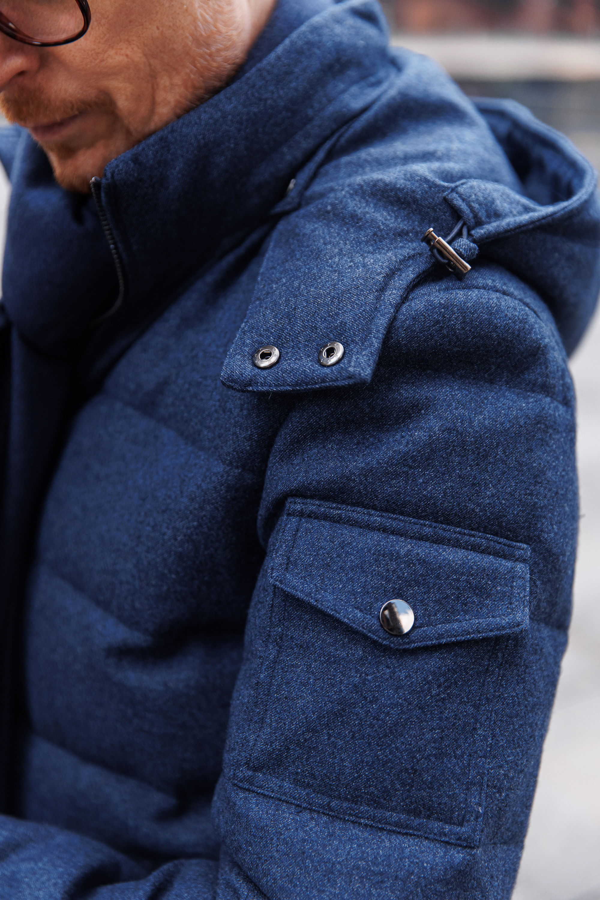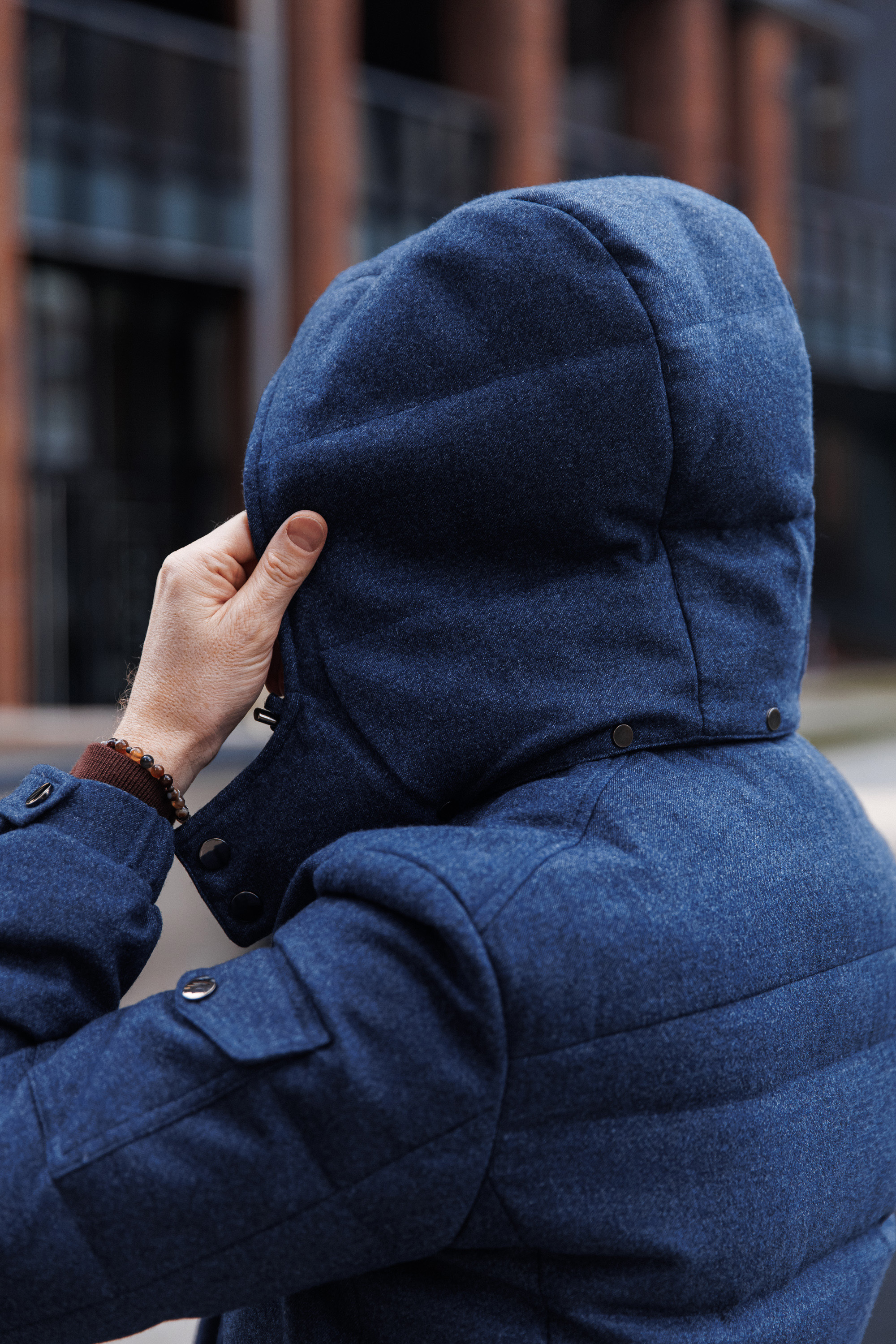 Укороченная куртка из фланели итальянской мануфактуры Drago, легендарной линии Rugby Flannel, с влагоотталкивающей обработкой. Съёмный капюшон, удобные карманы на молнии, регуляторы манжет и тёплый натуральный утеплитель делают модель практичной для городского ритма.