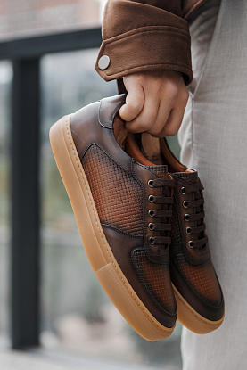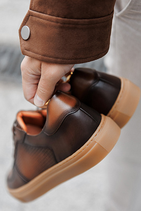 Роскошные сникеры глубокого коньячного оттенка со сложным градиентом и изысканным тиснением. Контрастная подошва цвета карамели гармонично дополняет верх пары и придаёт практичности. Универсальность, эстетика и стиль соединяются здесь с комфортом спортивной обуви.