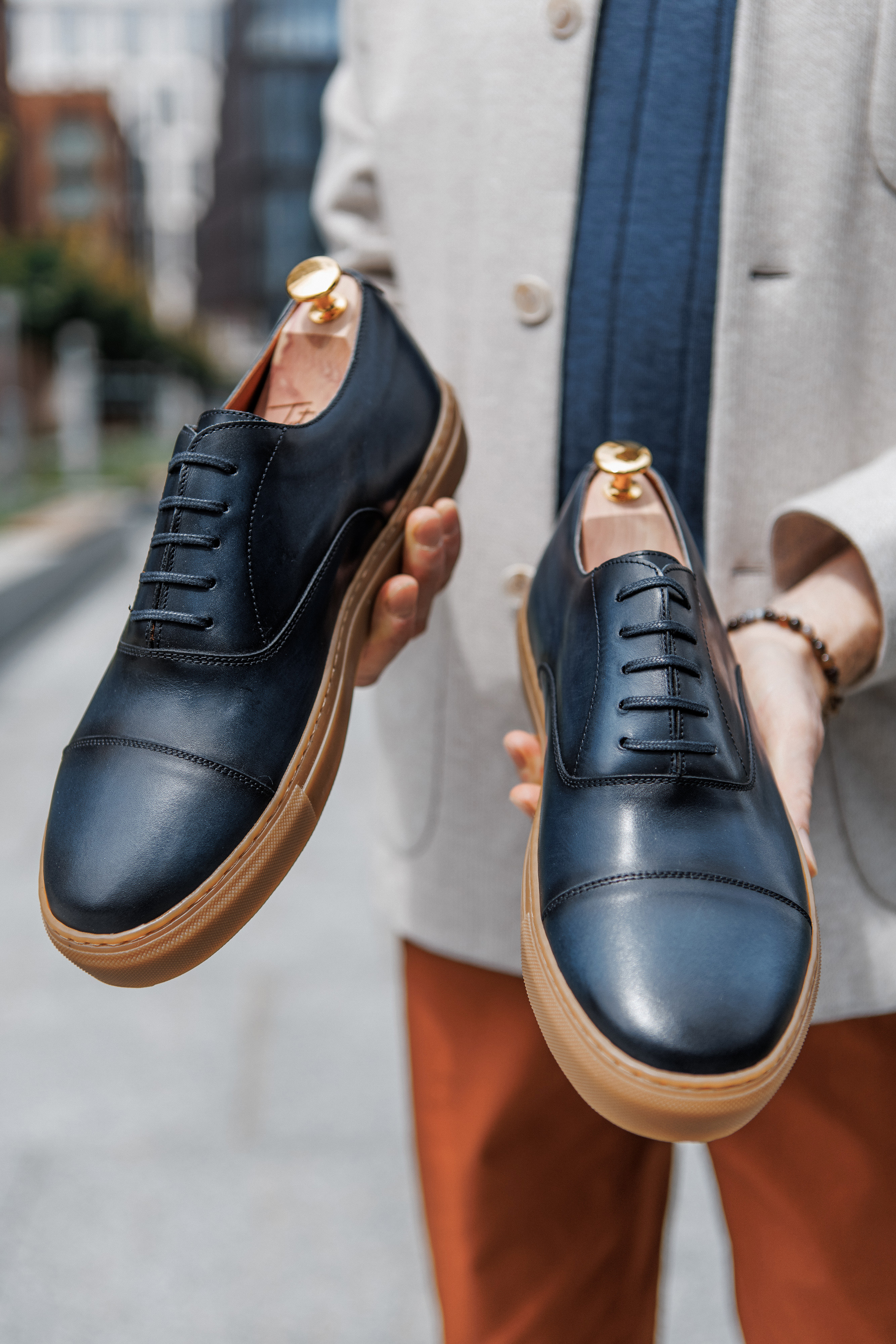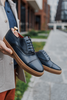 Сникеры в самой консервативной интерпретации, стилизованные под классические оксфорды с отрезным носком. Верх выполнен из гладкой телячьей кожи глубокого синего оттенка, а контрастная подошва цвета карамели добавляет акцент и повышает практичность в эксплуатации.