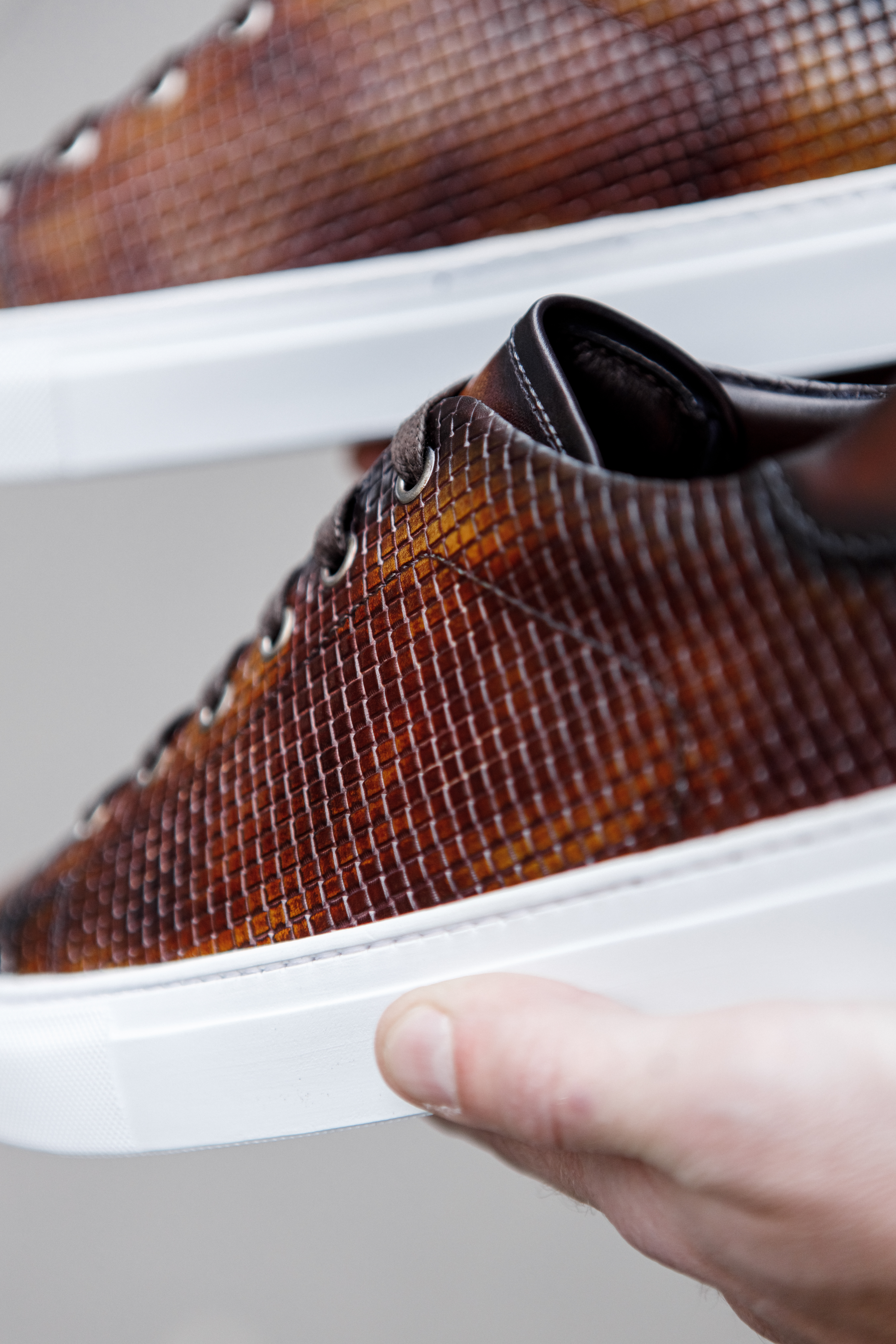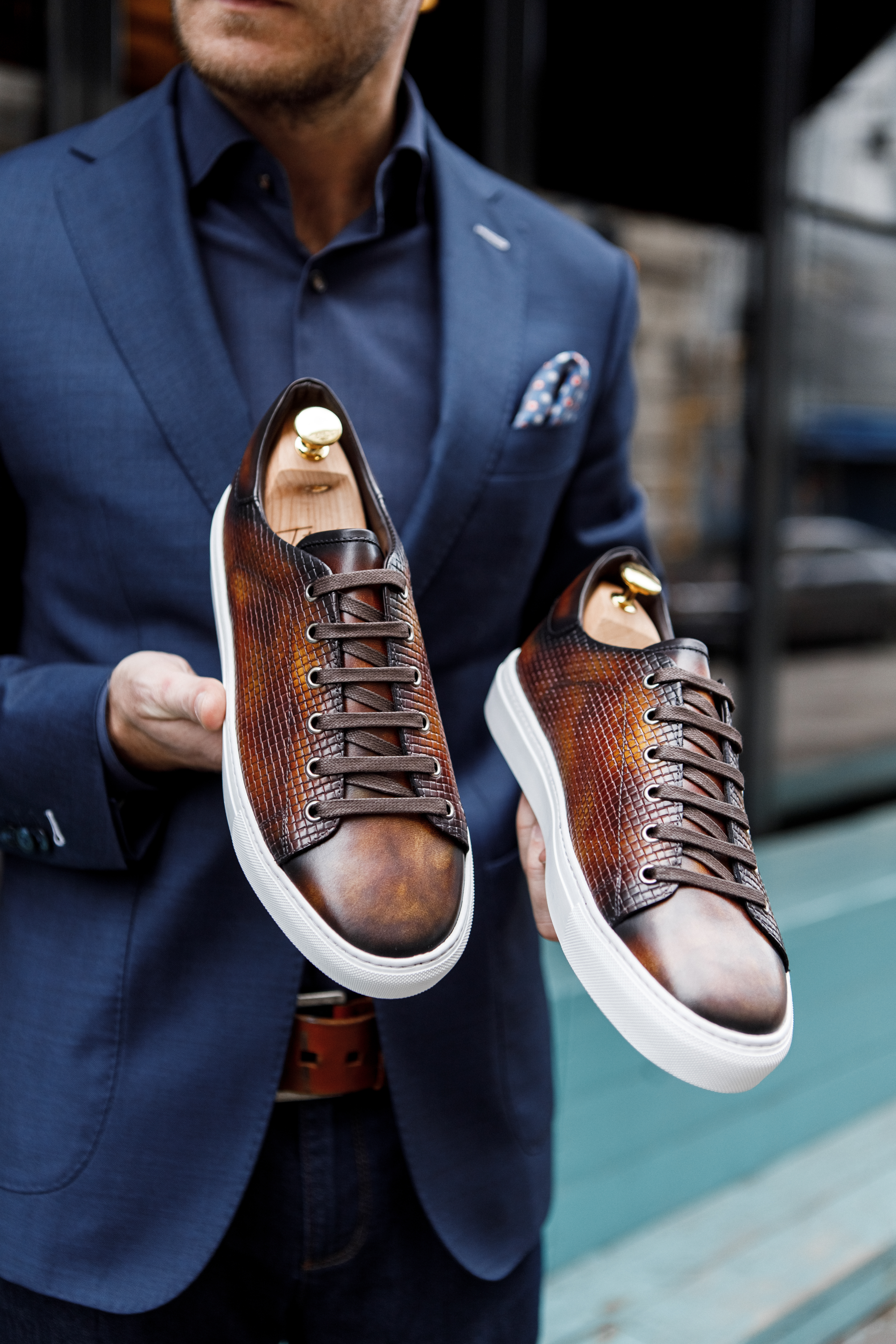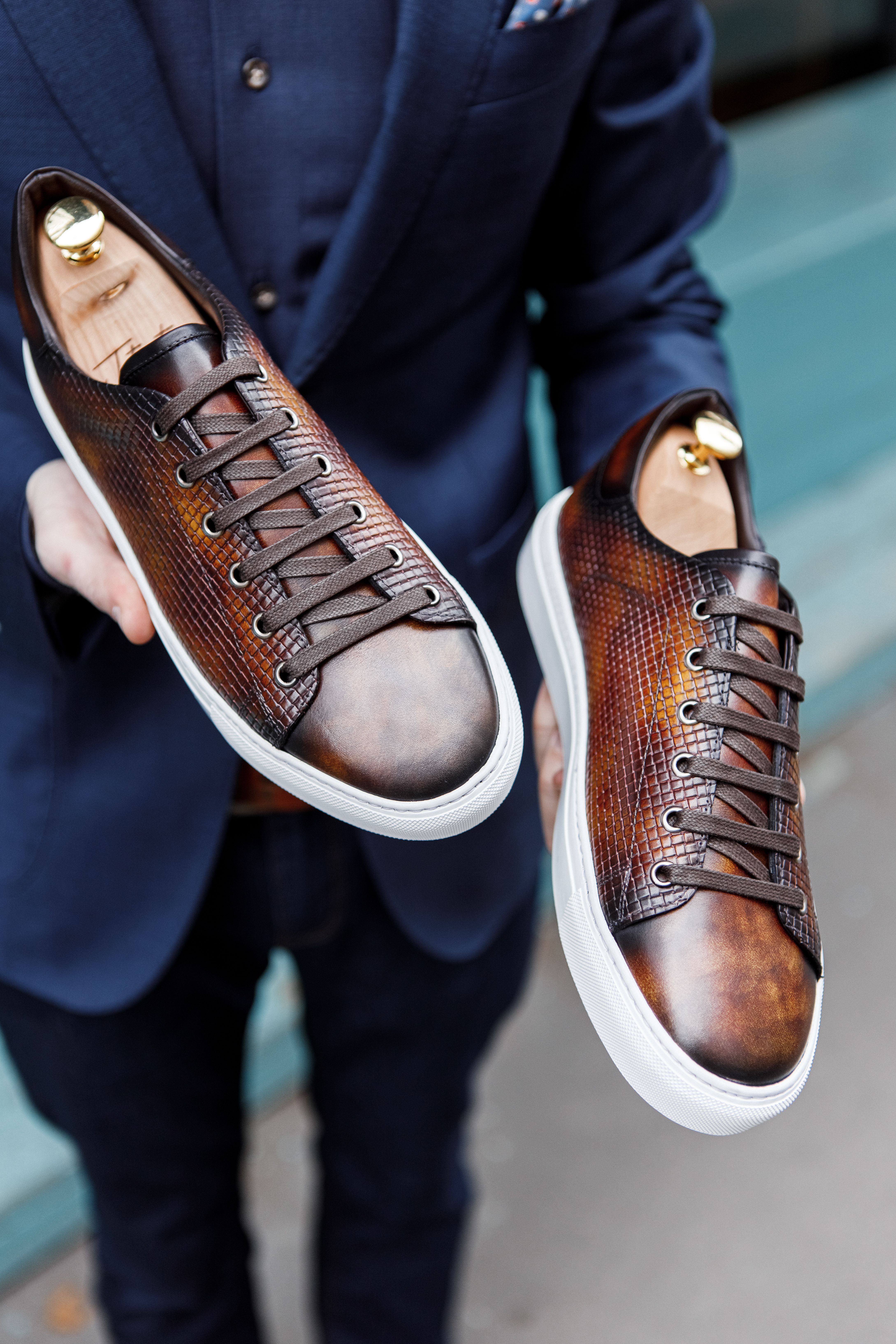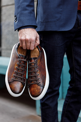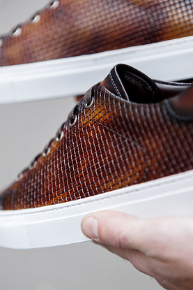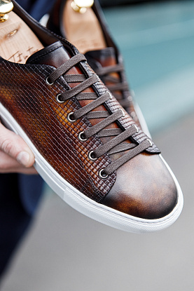 Сникеры из кожи теленка в ручном окрасе и декором в виде тиснения. Прекрасный пример, когда повседневная комфортная обувь может быть уместна и с пиджаком!