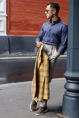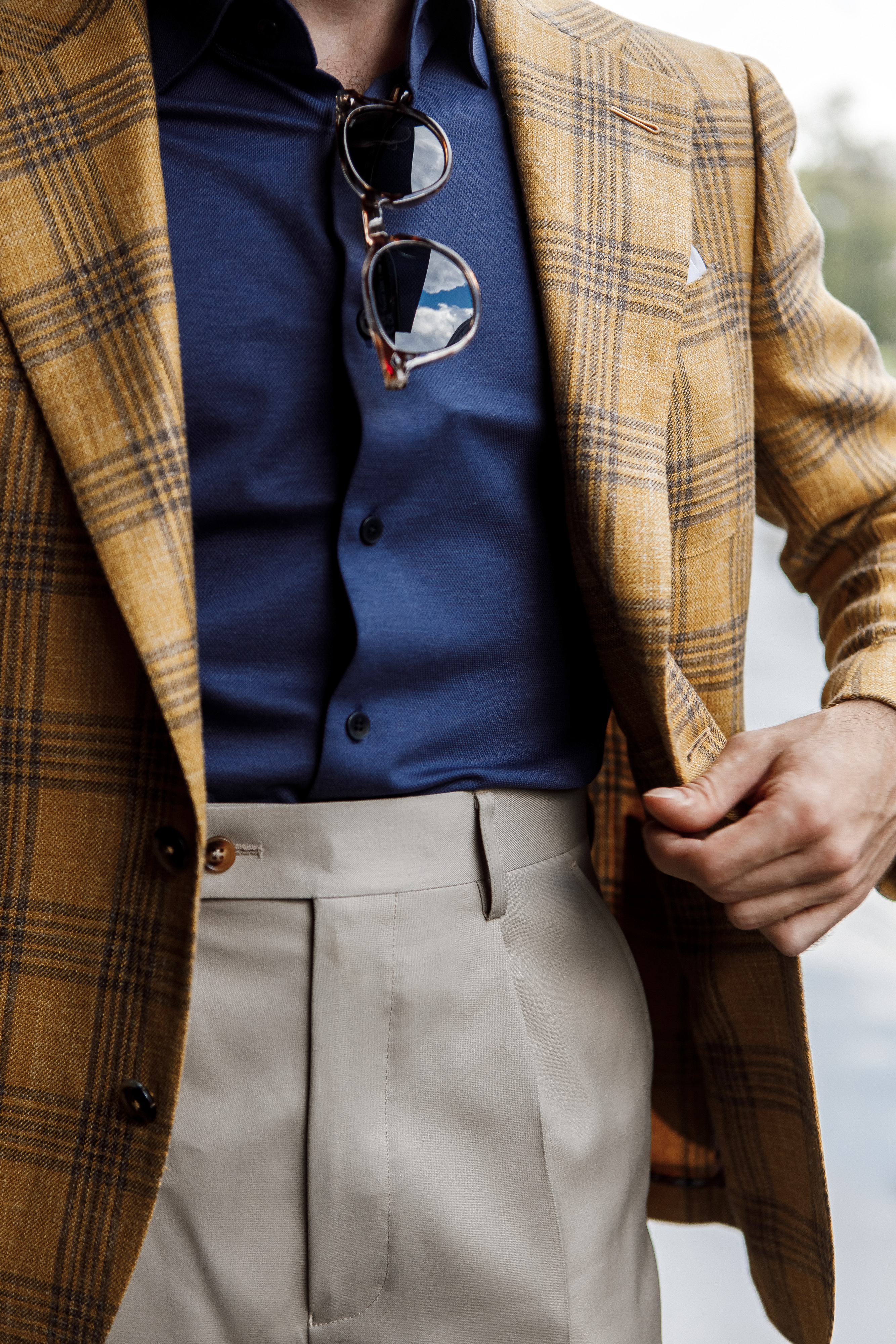Пиджак из смесовой ткани итальянского бренда Stylbiella с сочетанием шёлка, хлопка и шерсти в оттенке тёплой охры с выразительной графичной клеткой. Охра — это цвет солнца и нагретых улиц. Оттенок дней, которые хочется проживать медленно – и красиво.