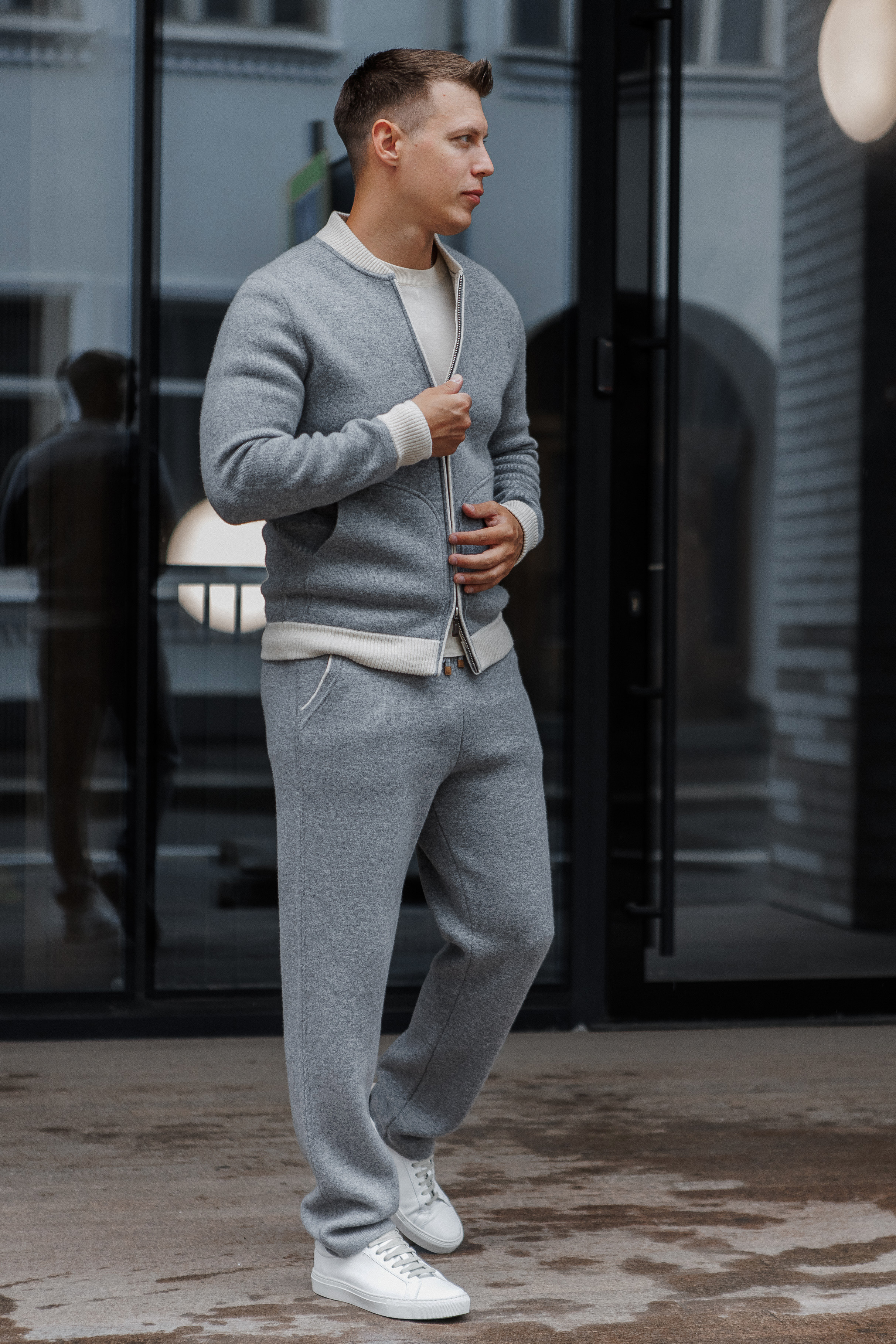 Костюм из мягкого кашемира в благородном сером оттенке, который одинаково уместен дома, в городе или путешествии. Бомбер на молнии с аккуратными карманами, контрастной отделкой манжет и пояса, брюки с прямым, слегка зауженным кроем. Идеальный выбор, когда комфорт становится главным элементом стиля.