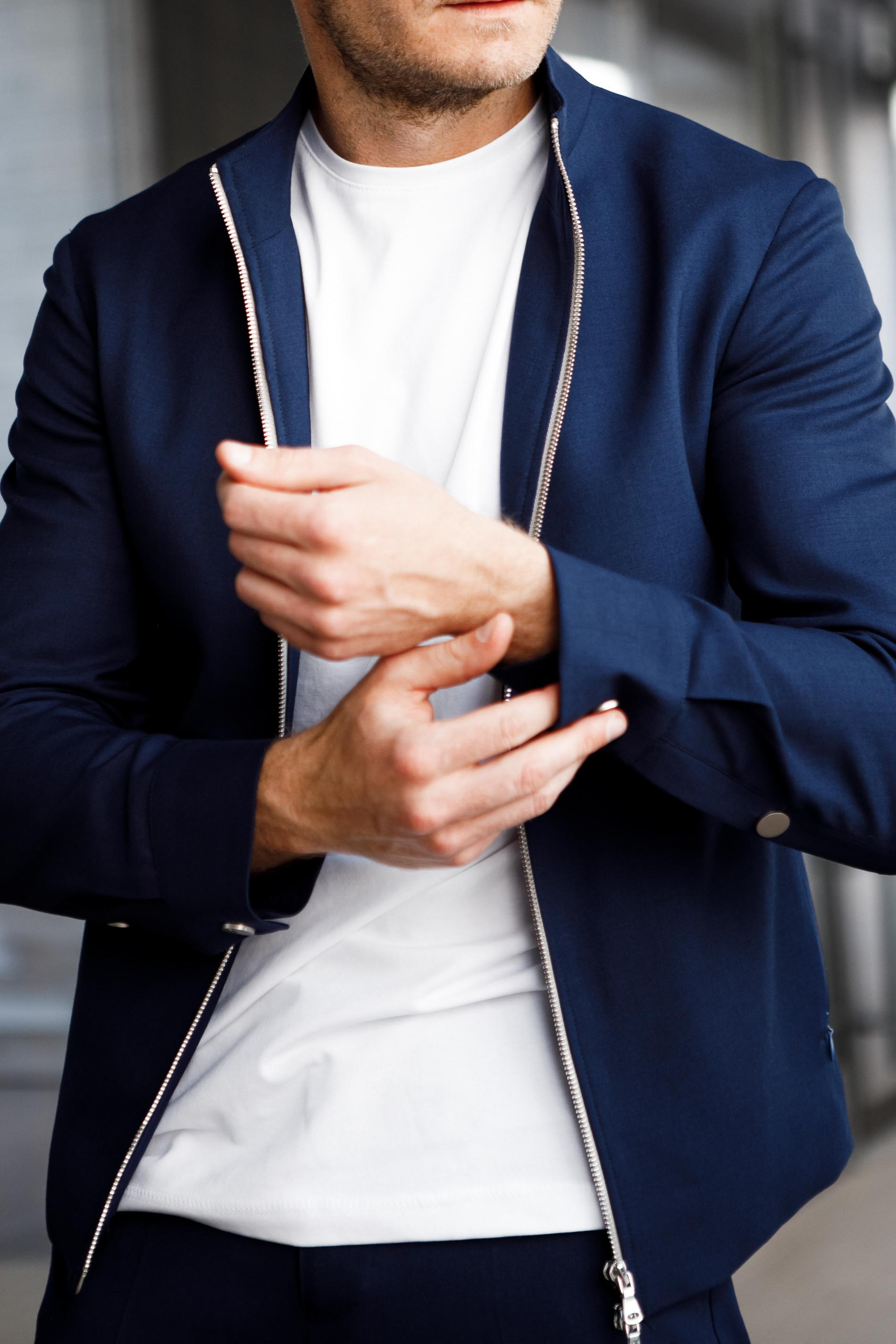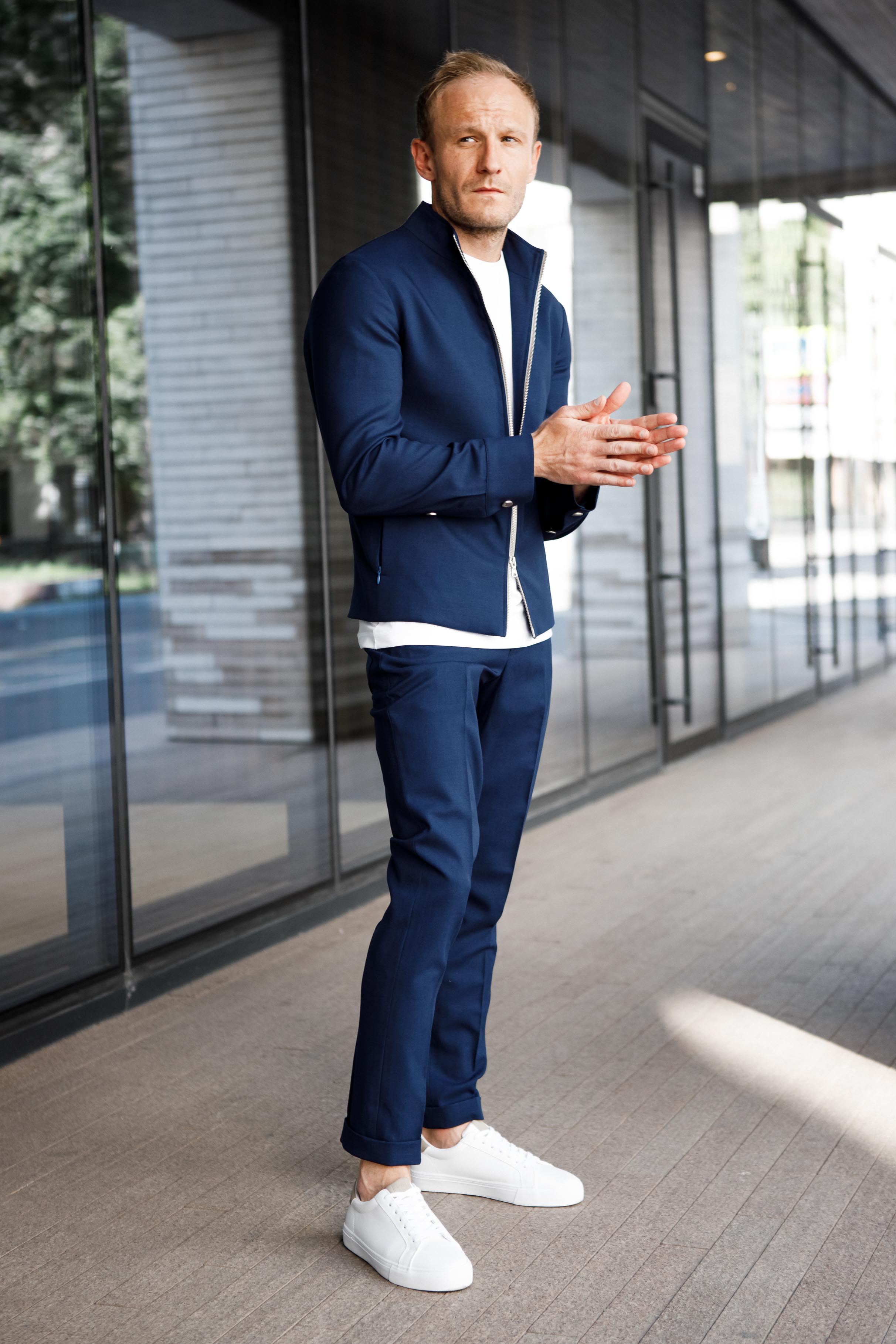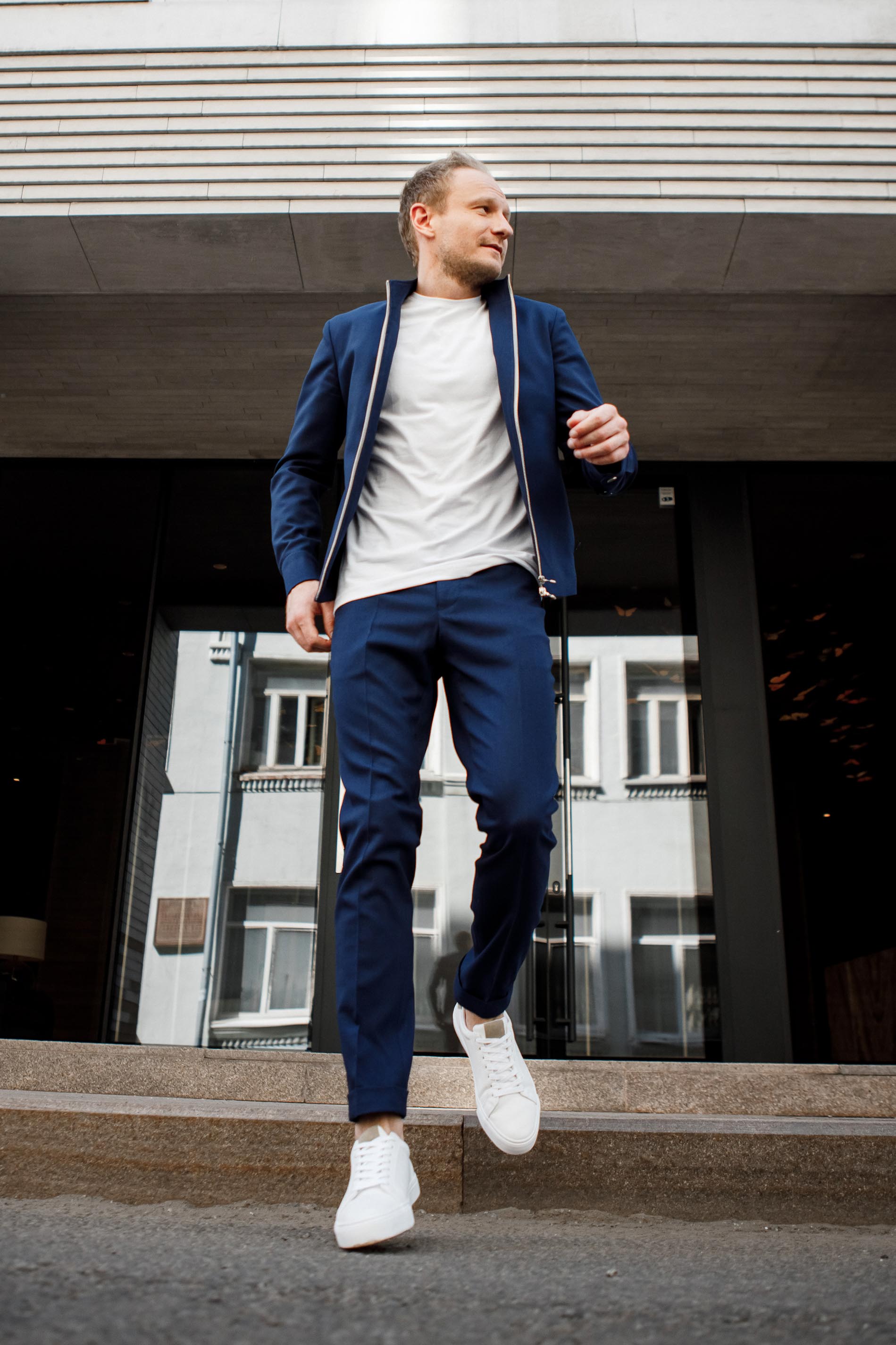 Темно-синий городской костюм настолько универсален, что подходит не только для неспешных прогулок по городу, но и для активного «барного серфинга»