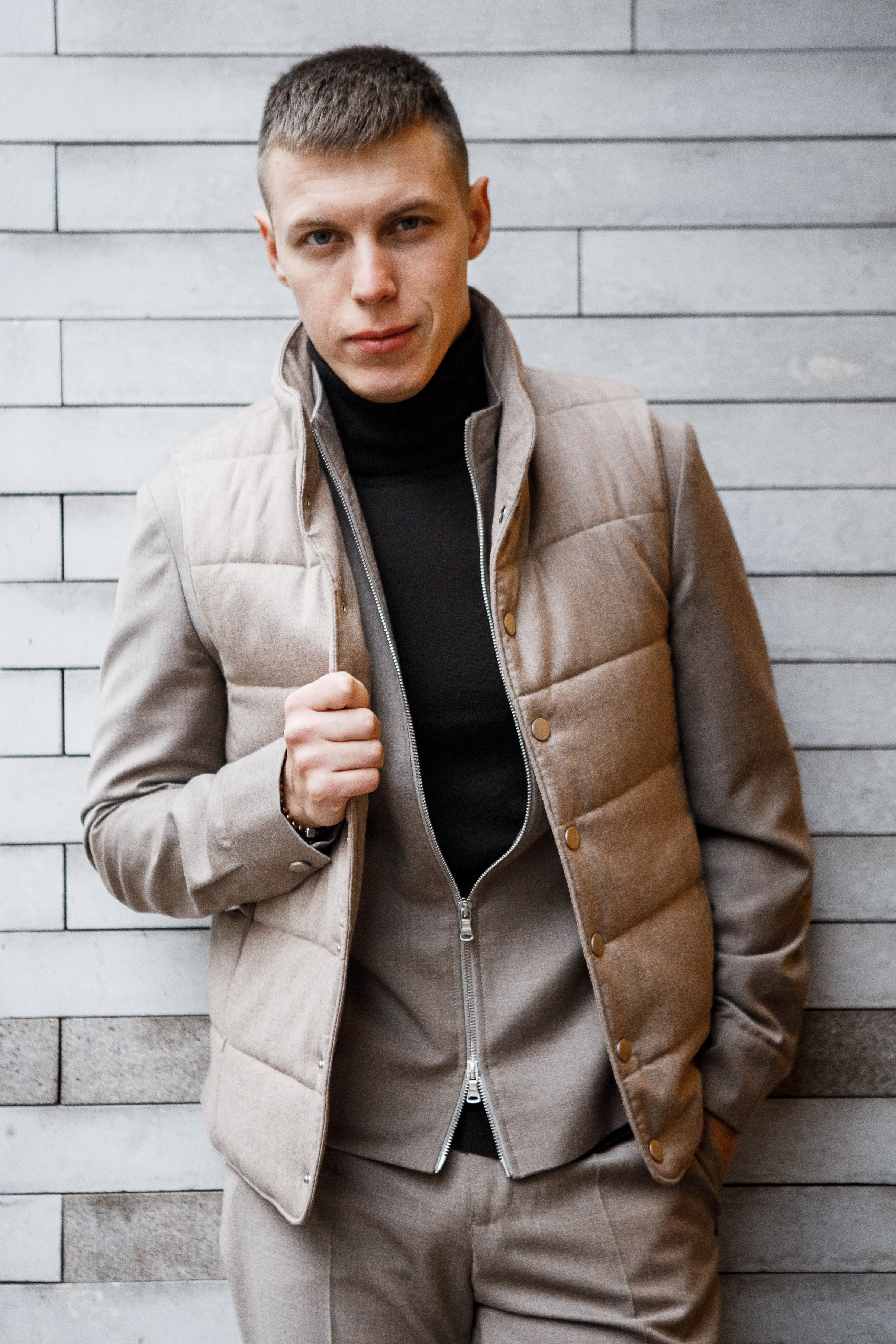Стеганый жилет из бежевой фланели – стильная функциональность для современного мужчины.