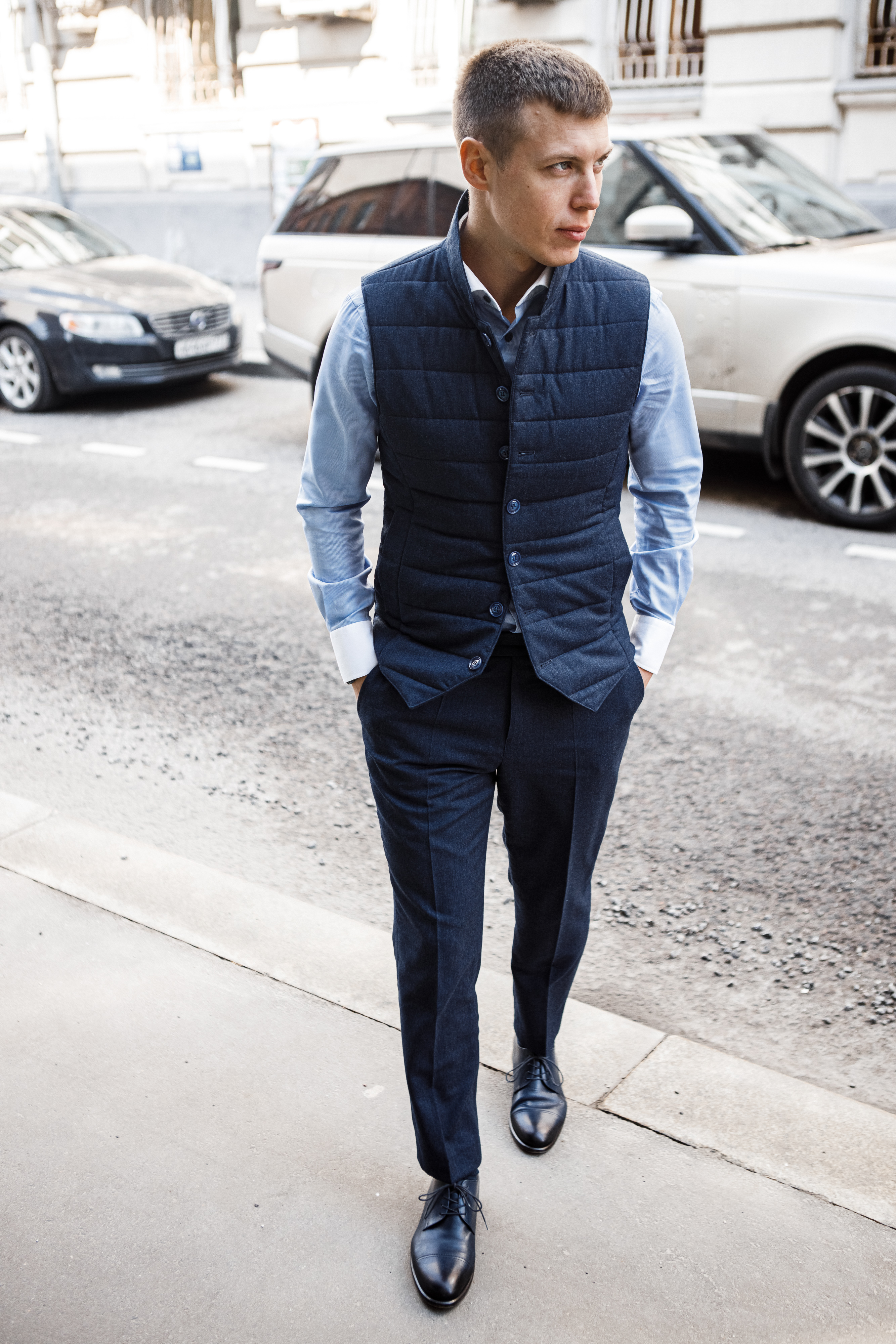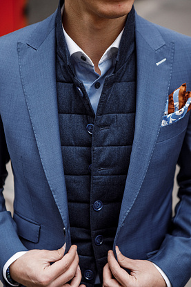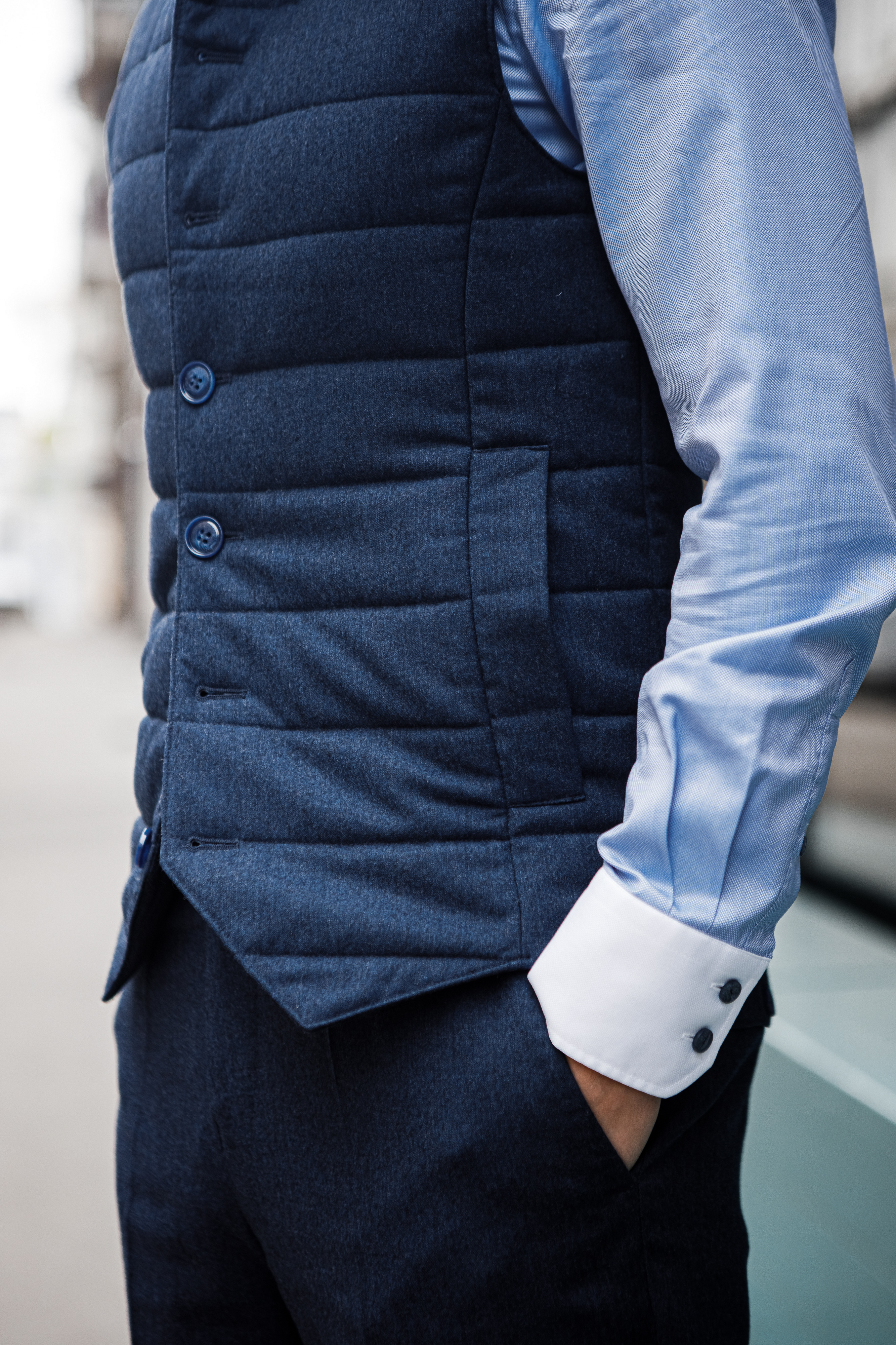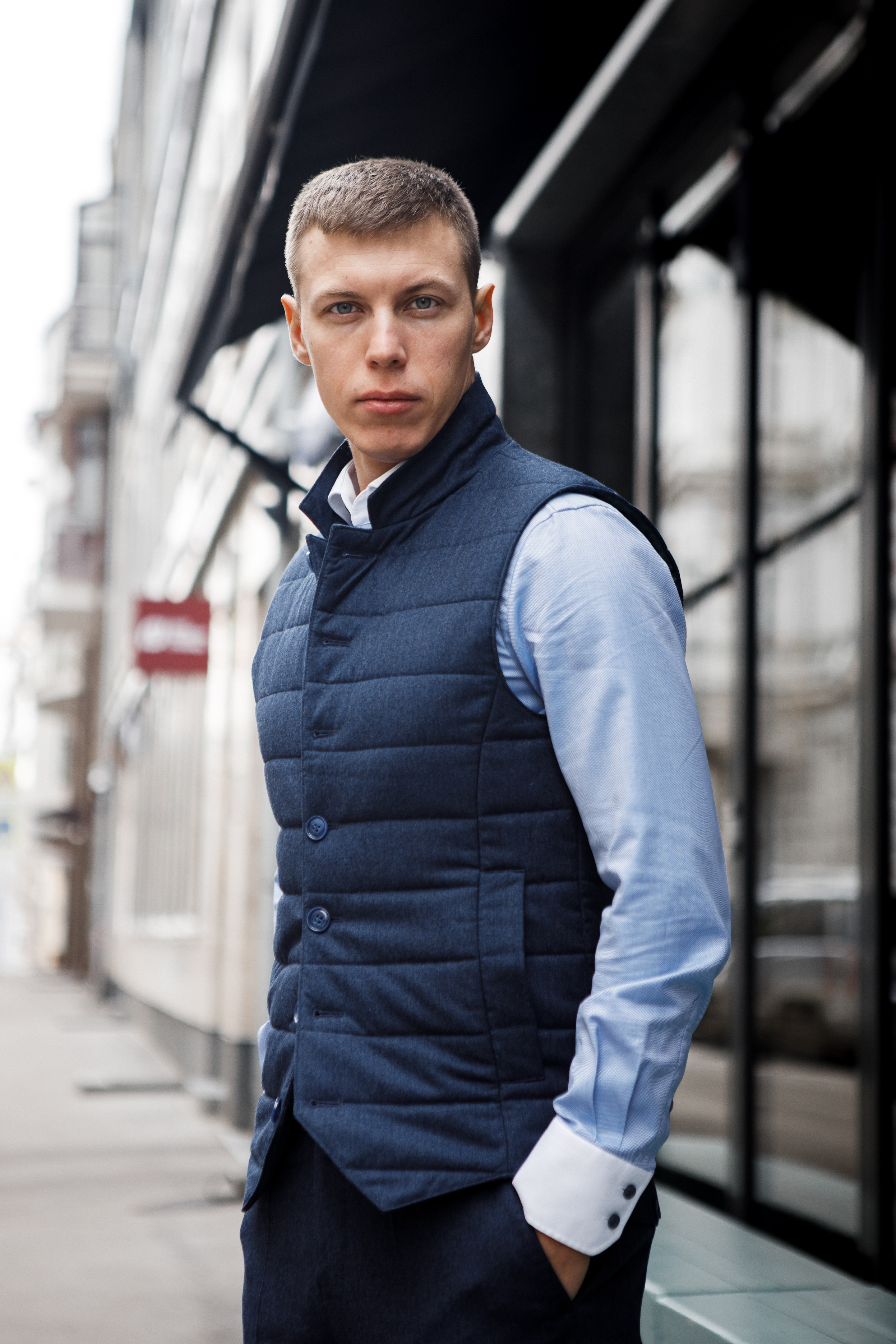 Легкий стеганый жилет с отложным воротником, скрытыми в рельефе карманами и изящным хлястиком на спинке. Он идеально сочетается с пиджаком и может служить самостоятельным верхним слоем.