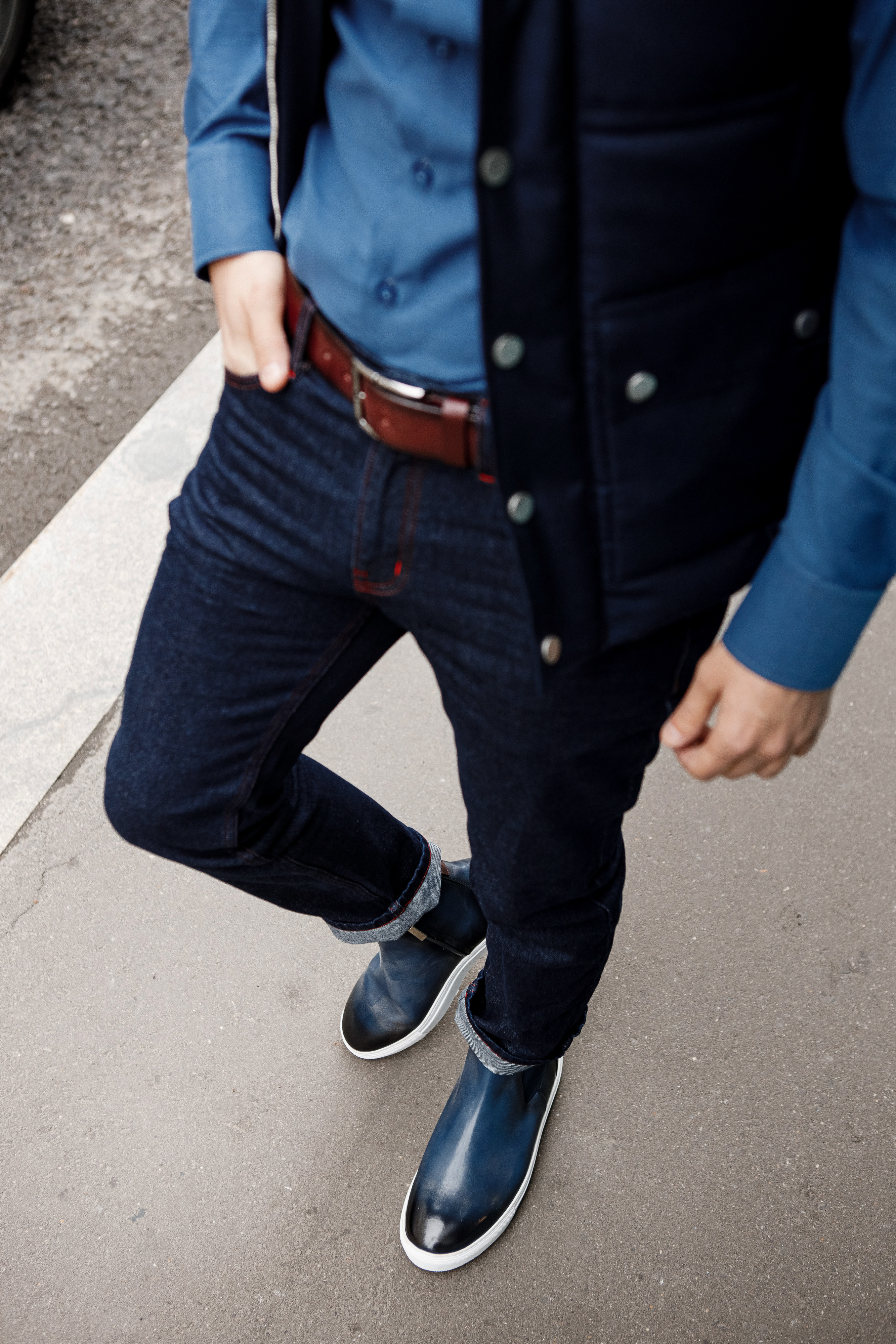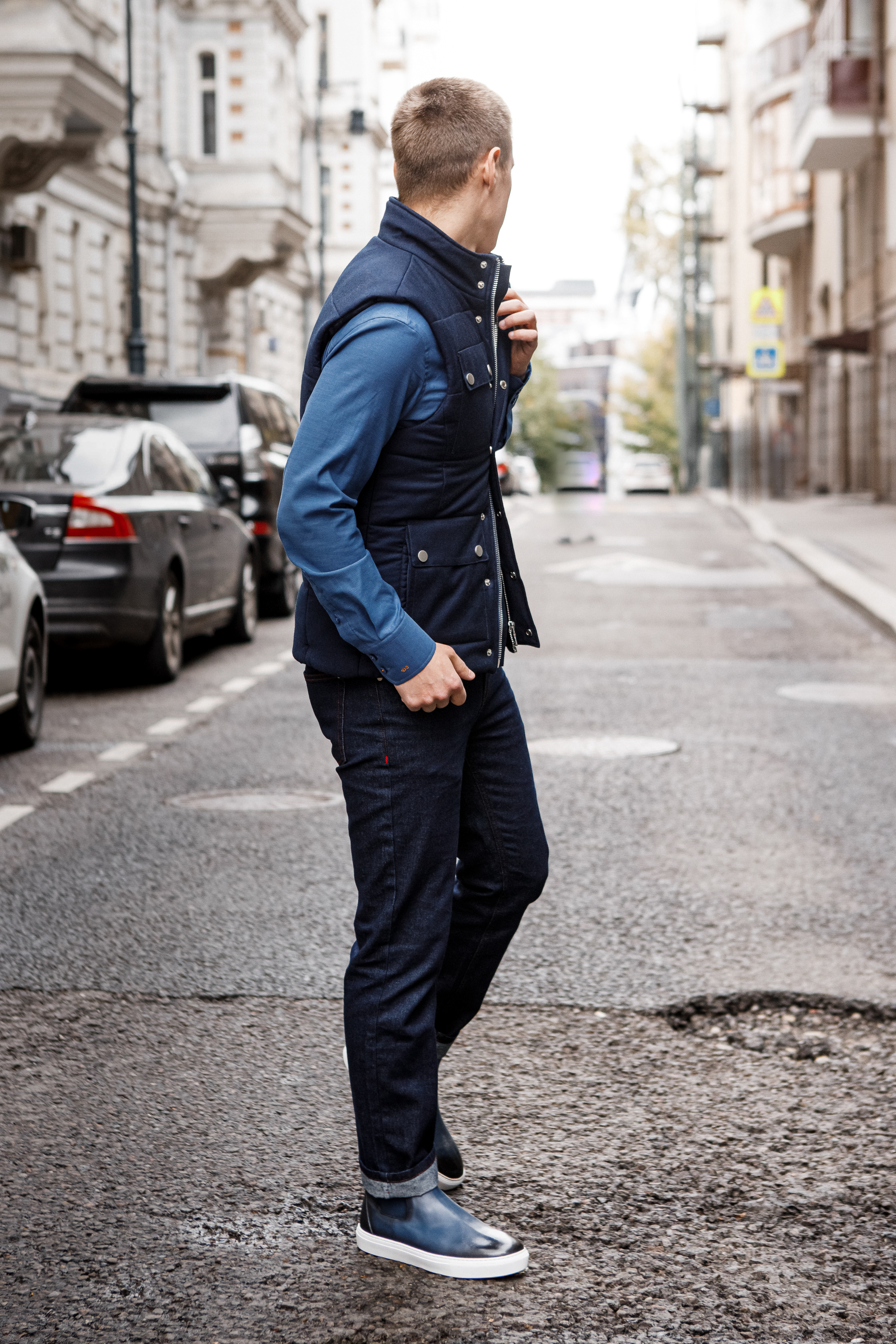 Темно-синий стеганый жилет с вместительными карманами – когда строгие правила делового стиля уступают место практичной функциональности.