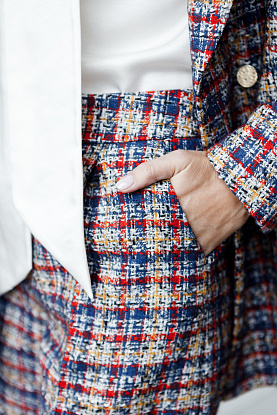 Концепт из роскошного фактурного букле от английского премиального бренда Holland & Sherry. Двубортный жакет в комплекте с шортами брючного кроя. Невесомая блузка из чистого шёлка и изящные лодочки в оттенке охра из мягкой замши - стиль в женской коллекции Just In Time.